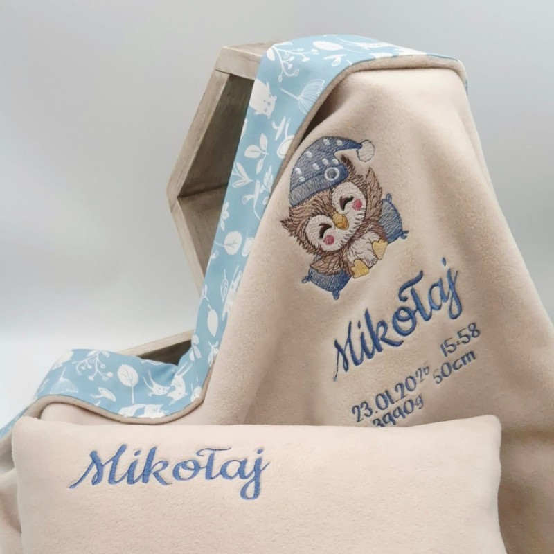 - dwustronny, haftowany KOCYK o wymiarze 75x100cm lub 100x135, wykonany z mięciutkiej dzianiny polarowej, połączonej z wysokiej jakości bawełną, na którym możesz umieścić również metryczkę (data narodzin, godzina, waga i długość)