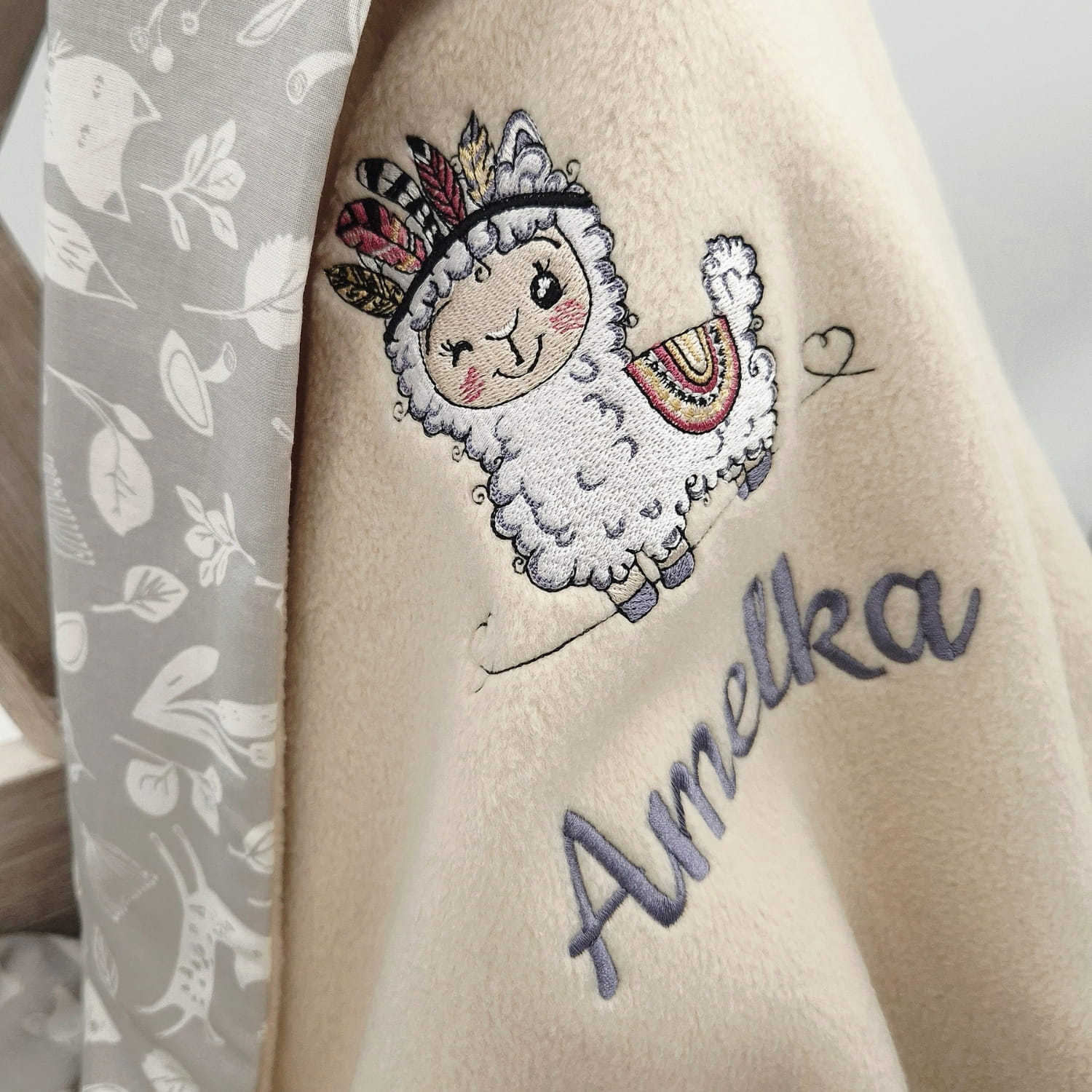 - dwustronny, haftowany KOCYK o wymiarze 75x100cm lub 100x135, wykonany z mięciutkiej dzianiny polarowej, połączonej z wysokiej jakości bawełną, na którym możesz umieścić również metryczkę (data narodzin, godzina, waga i długość)