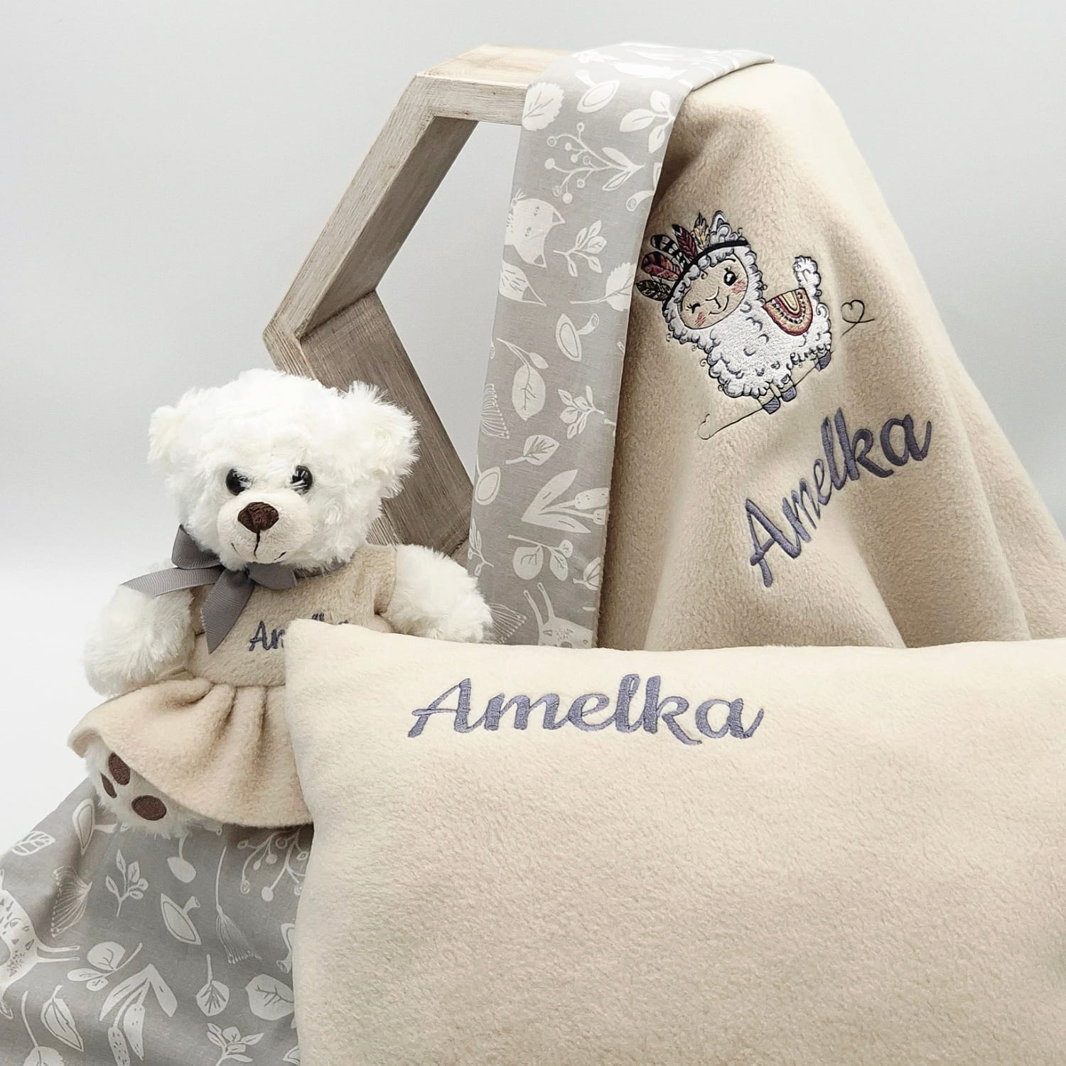 KOCYK PODUSZKA i MIŚ z imieniem i metryczką LAMA boho