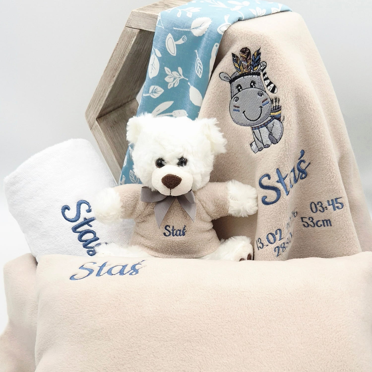 Personalizacja to nasz atut - wygraweruj imię dziecka oraz szczegóły z metryczki: data i godzina narodzin, waga i długość, tworząc wyjątkowy i niepowtarzalny prezent. Dostępne są neutralne kolory, takie jak szary, beż, błękit i pastelowe odcienie, które pasują do każdego wnętrza.