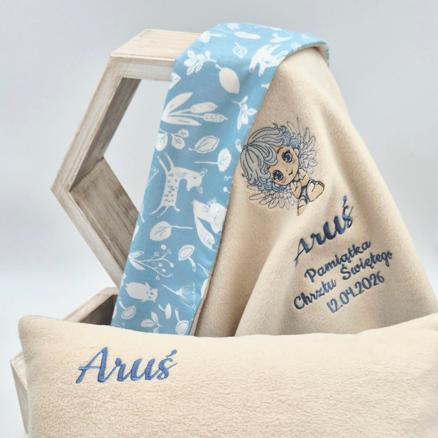 Personalizowany zestaw na Chrzest Święty dla chłopca z motywem aniołka to wyjątkowa i elegancka pamiątka chrztu z imieniem dziecka, która pozostanie z rodziną na długie lata. W zestawie znajdują się dwa dopasowane elementy: kocyk i poduszka z haftowanym imieniem, tworzące piękny i praktyczny komplet na tę szczególną okazję.