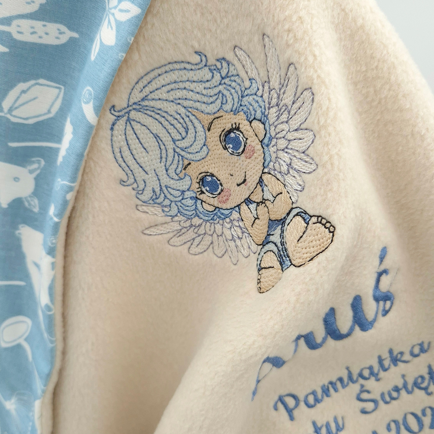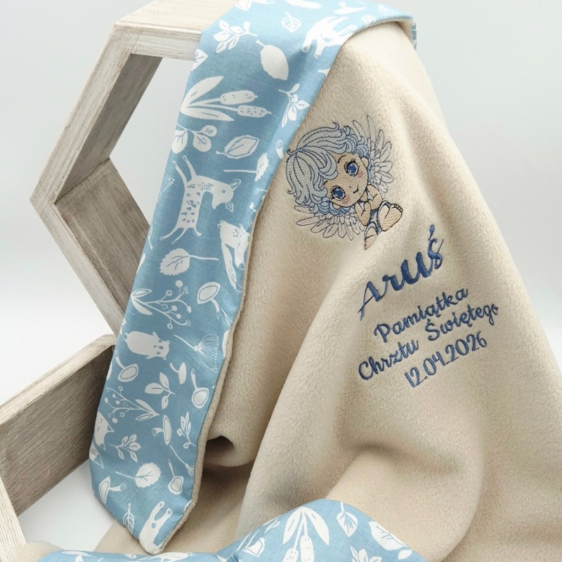 Personalizowany kocyk na Chrzest Święty dla chłopca z motywem aniołka to wyjątkowa i elegancka pamiątka chrztu z imieniem dziecka, która pozostanie z rodziną na długie lata.
