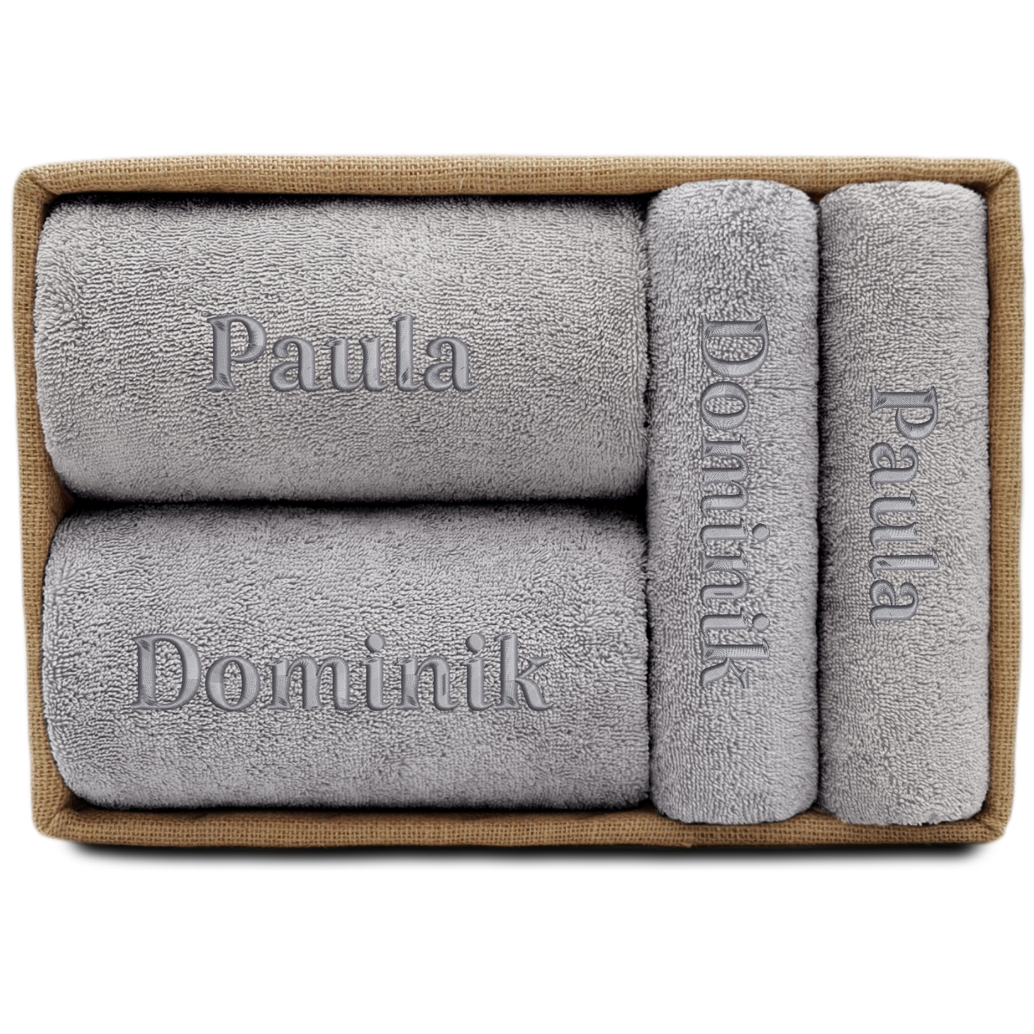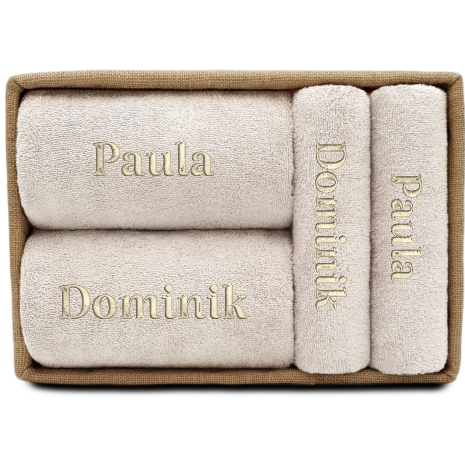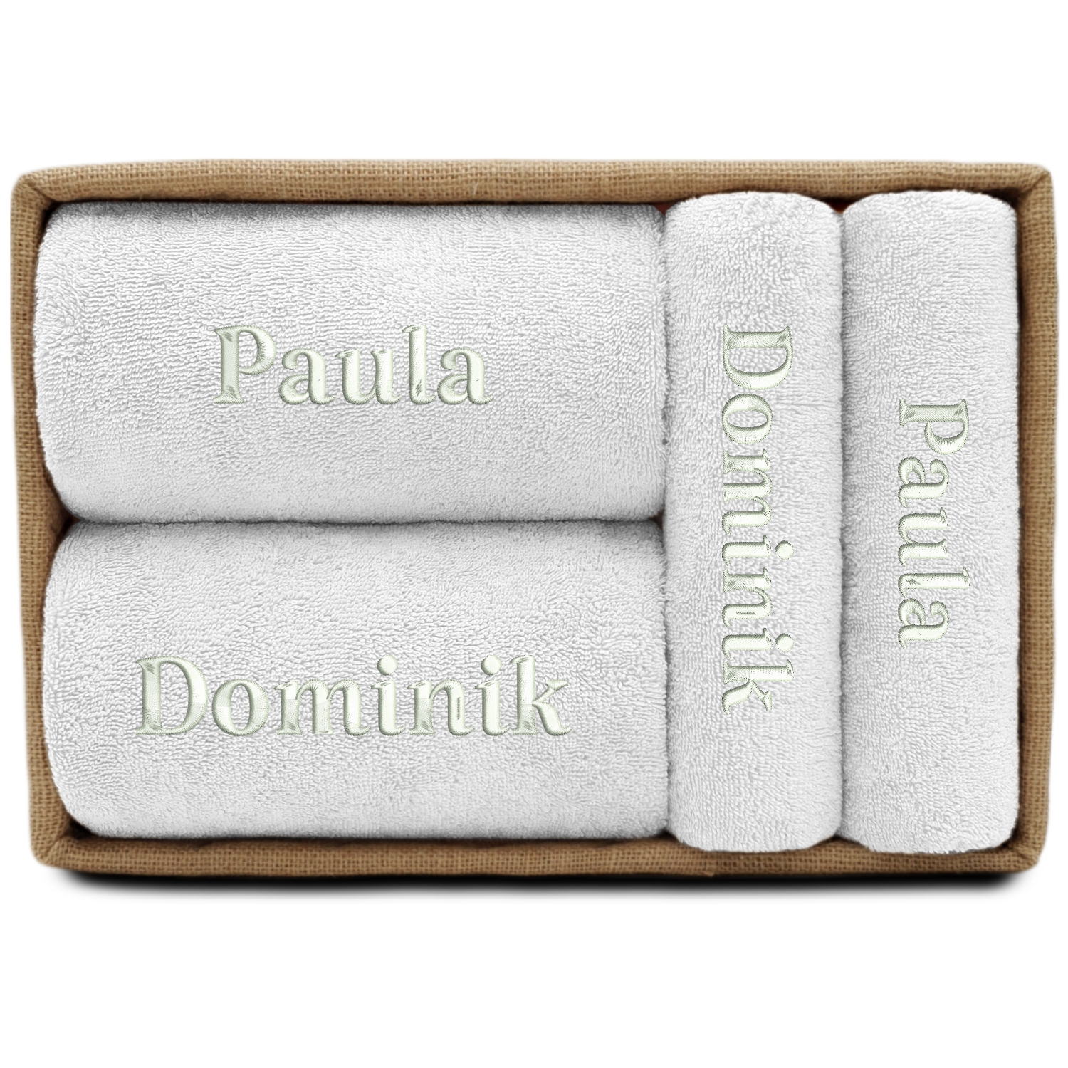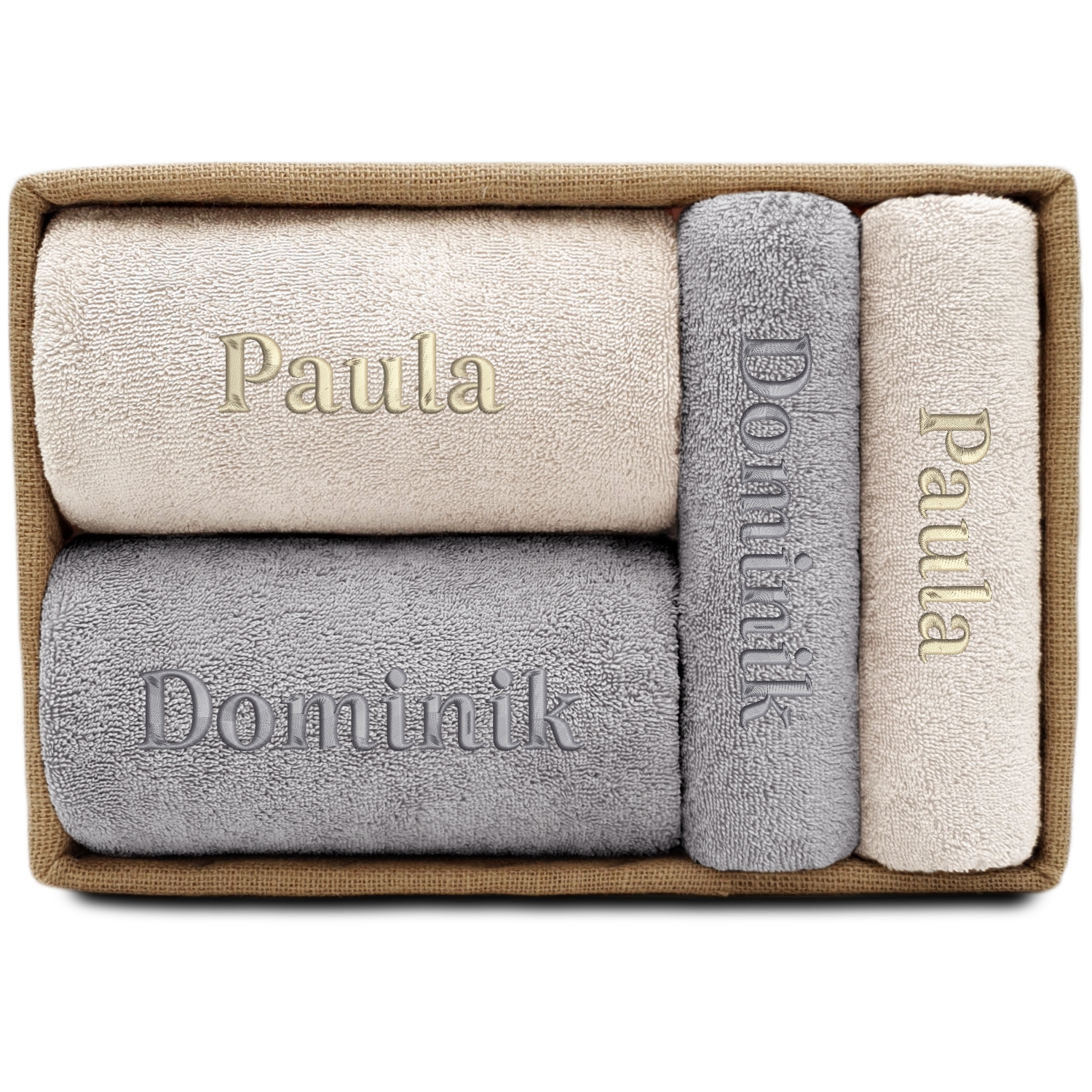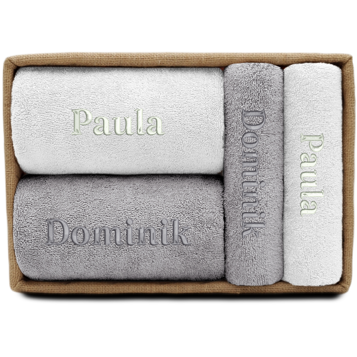 - prezent dla dwojga – 4 ręczniki w koszu z imionami pary