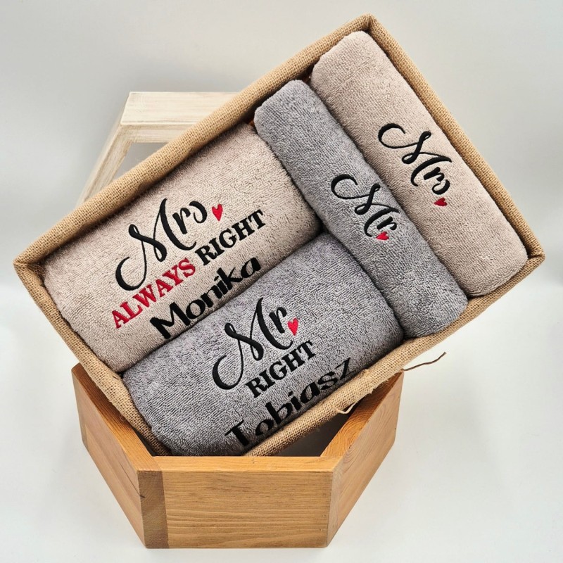 PREZENT ŚLUBNY 4 ręczniki w koszu Mr Right / Mrs Always Right