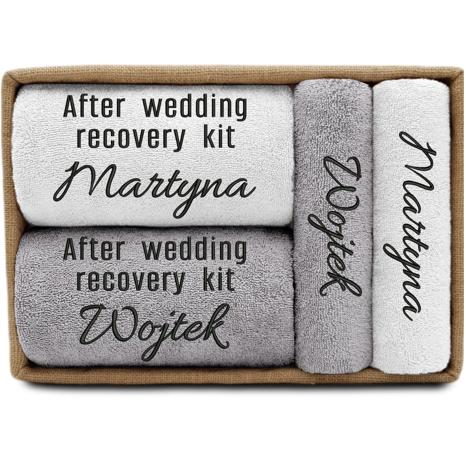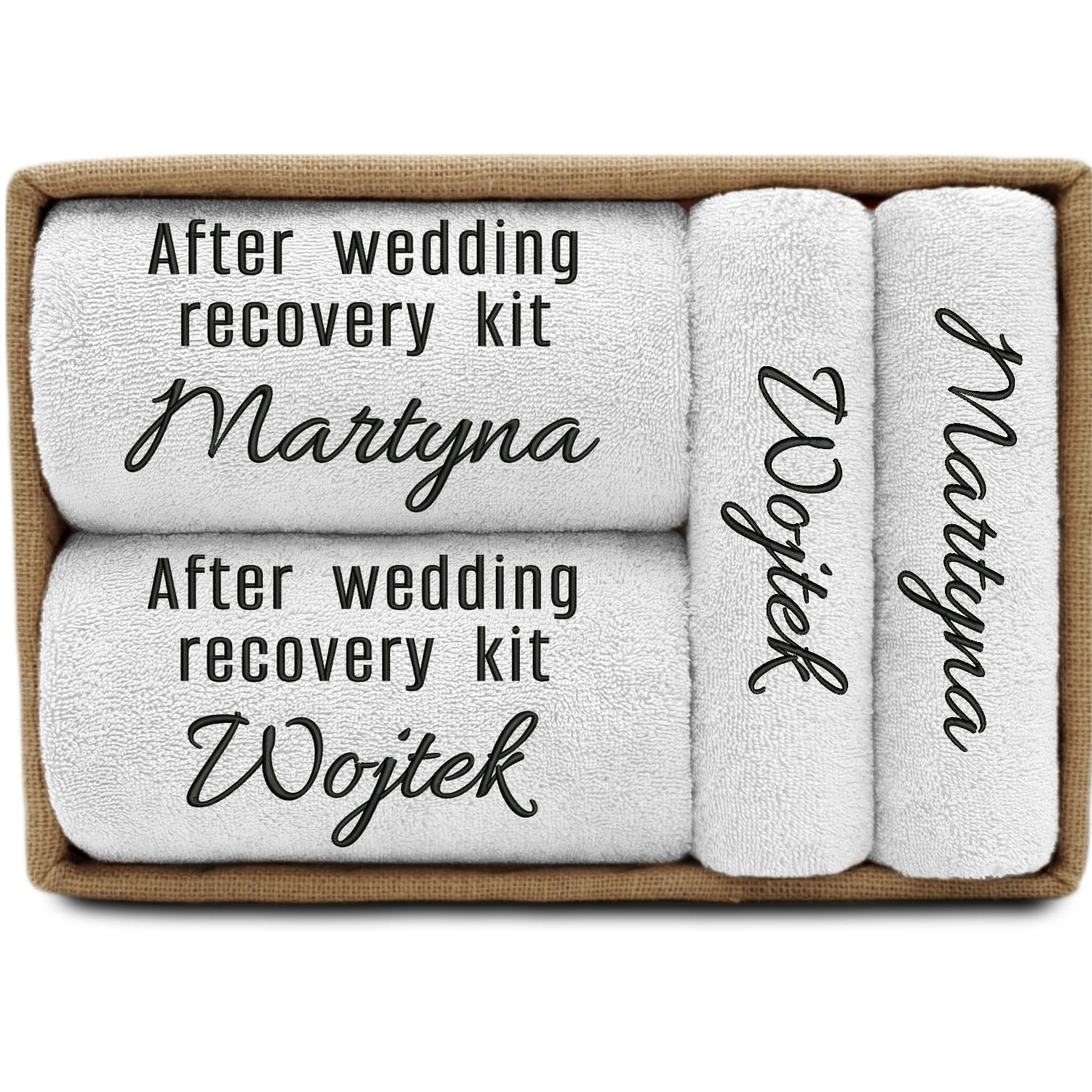 Zestaw składa się z czterech ręczników z imionami Pary Młodej umieszczonymi na każdym z nich — pięknie ułożonych w eleganckim koszu, gotowych, by stać się częścią ich nowego wspólnego życia. Hasło „After Wedding Recovery Kit” to subtelny żart i jednocześnie przypomnienie, że każdy dobry początek dnia zasługuje na miękką oprawę — szczególnie po nocy pełnej świętowania.