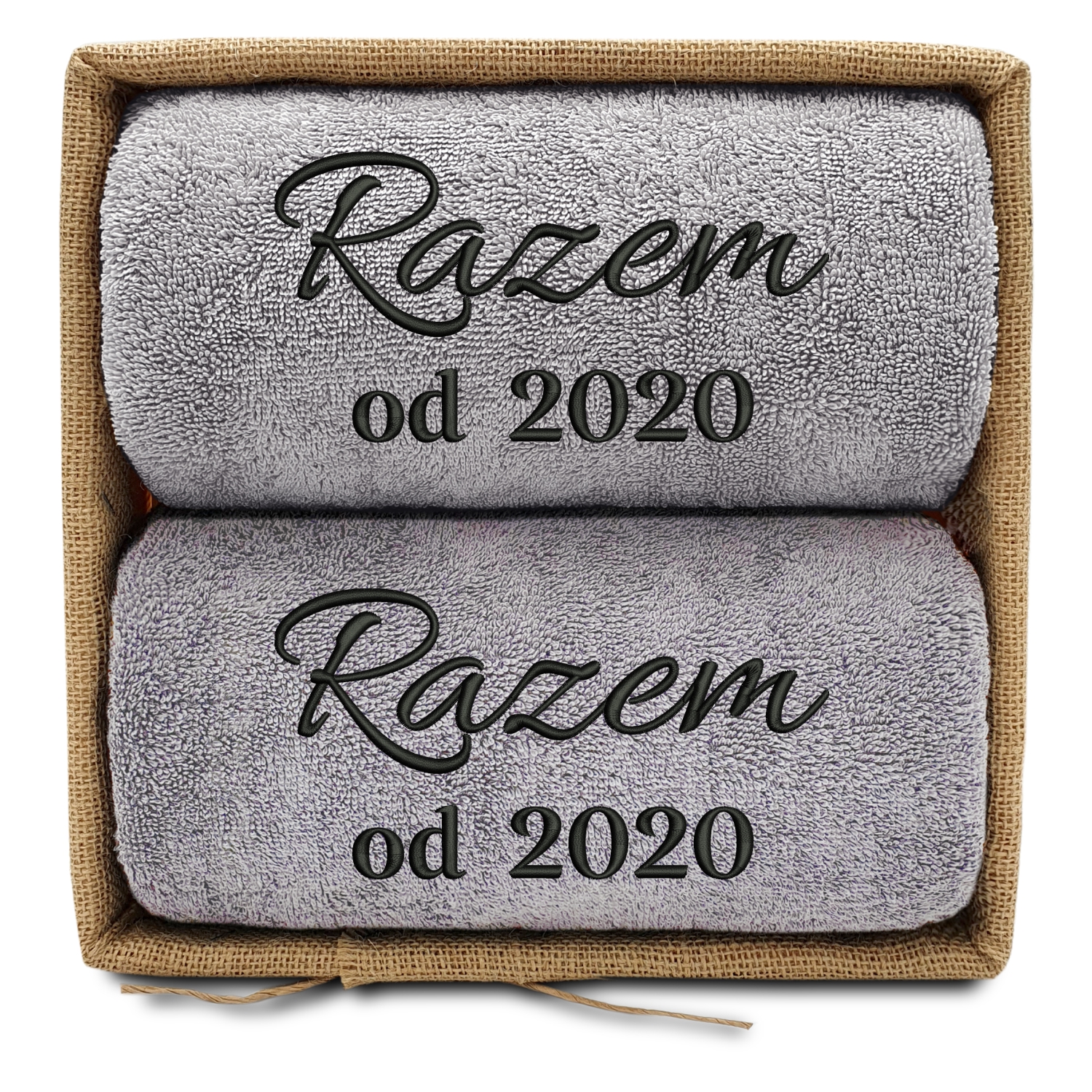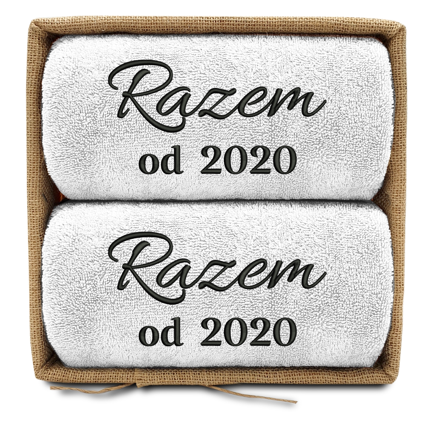 Komplet dwóch personalizowanych ręczników z motywem „Razem” to propozycja dla par, które po prostu chcą być… razem – na co dzień i od święta.