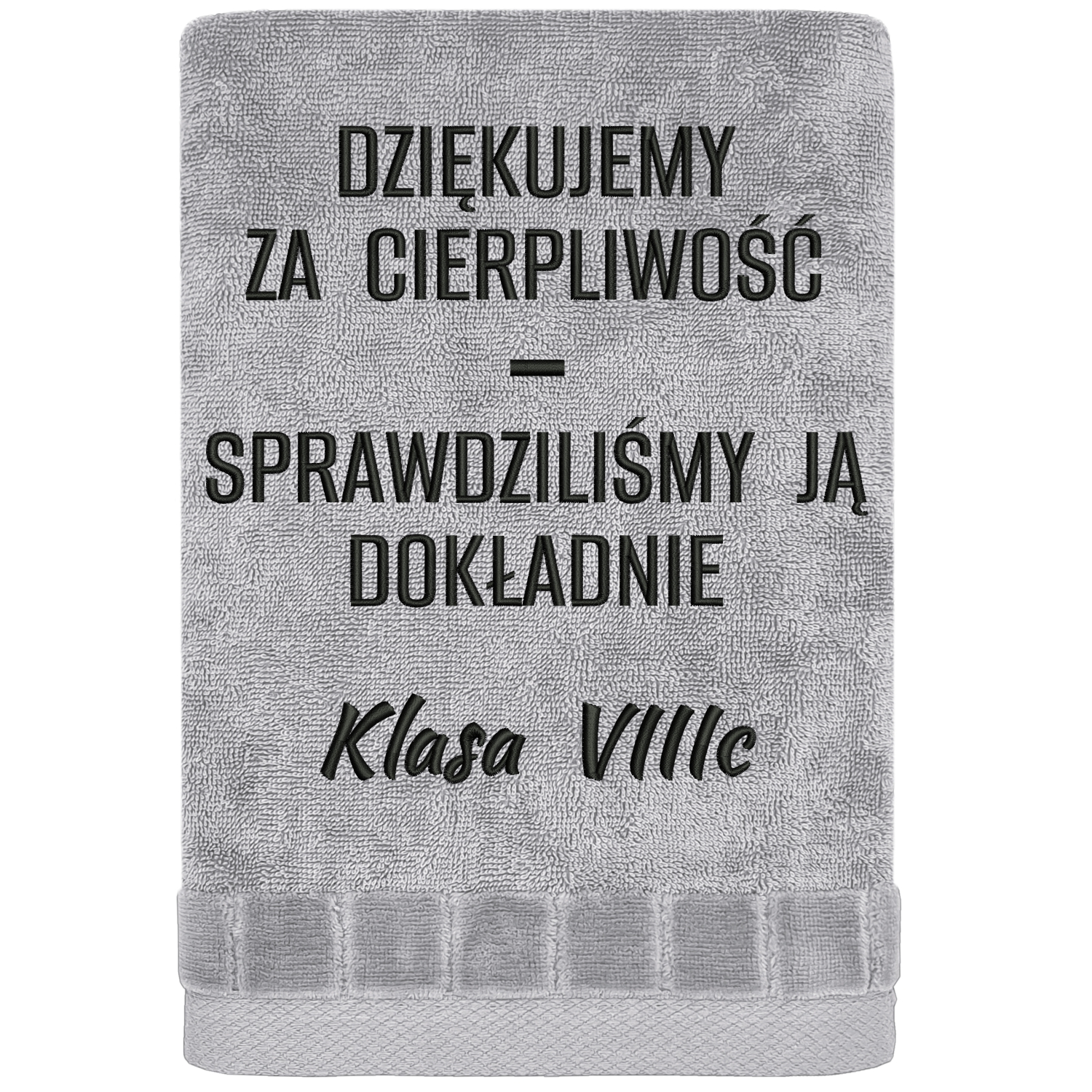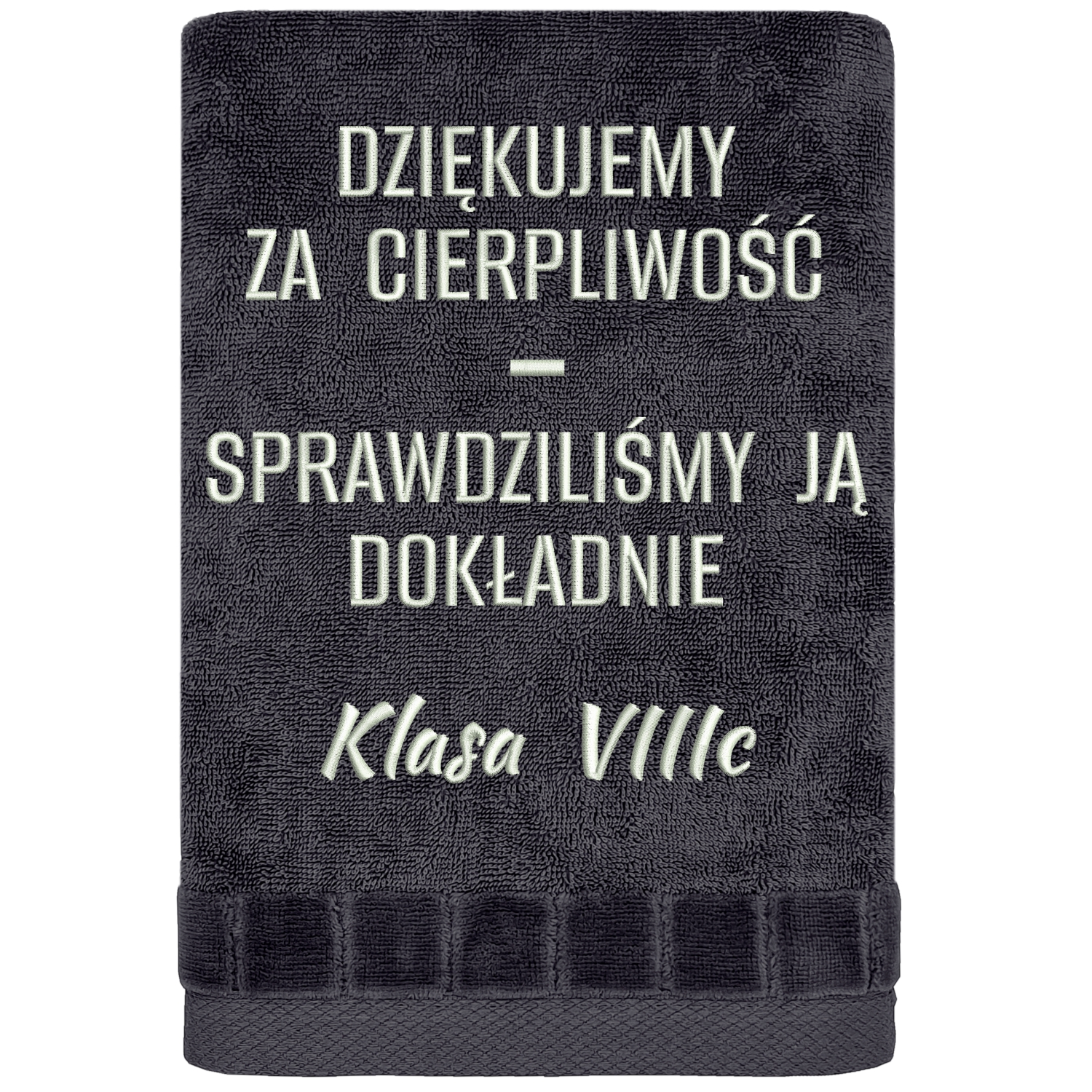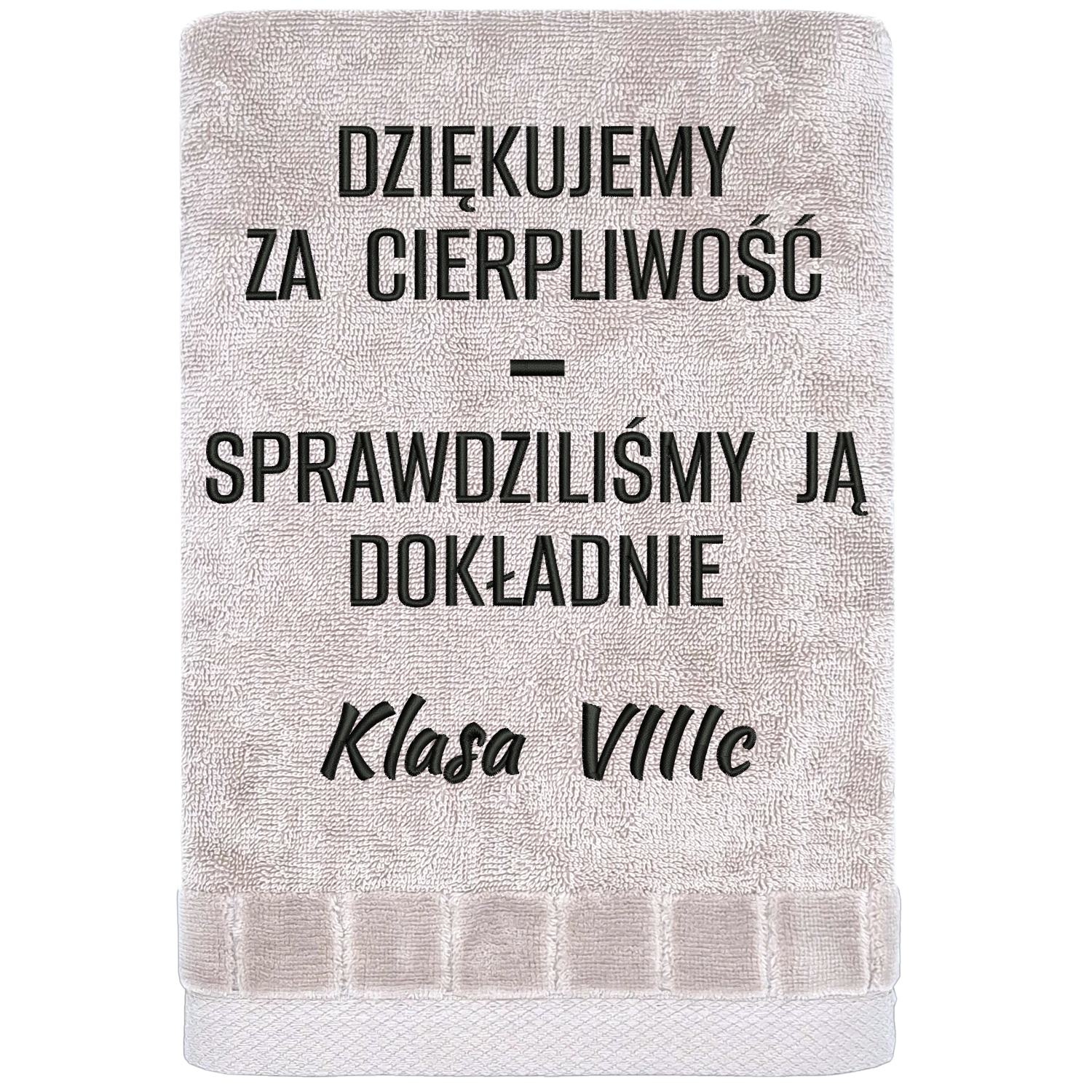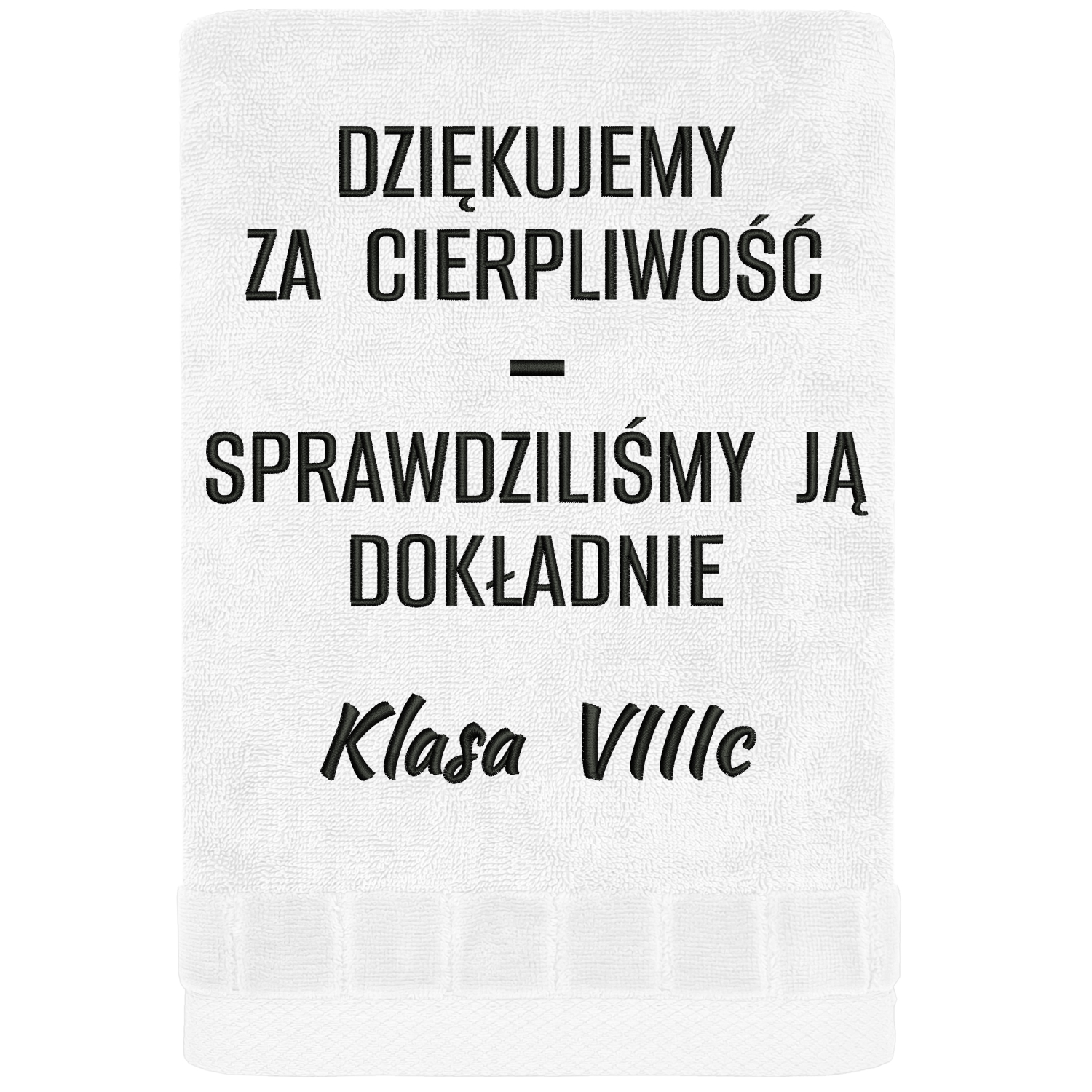 Są nauczyciele, którzy „po prostu uczą”… i są tacy, którym należą się podziękowania z konkretnym ciężarem. Ten ręcznik dla nauczyciela „Dziękujemy za cierpliwość” to właśnie ten drugi przypadek – prosty przekaz, ale trafia dokładnie tam, gdzie trzeba.