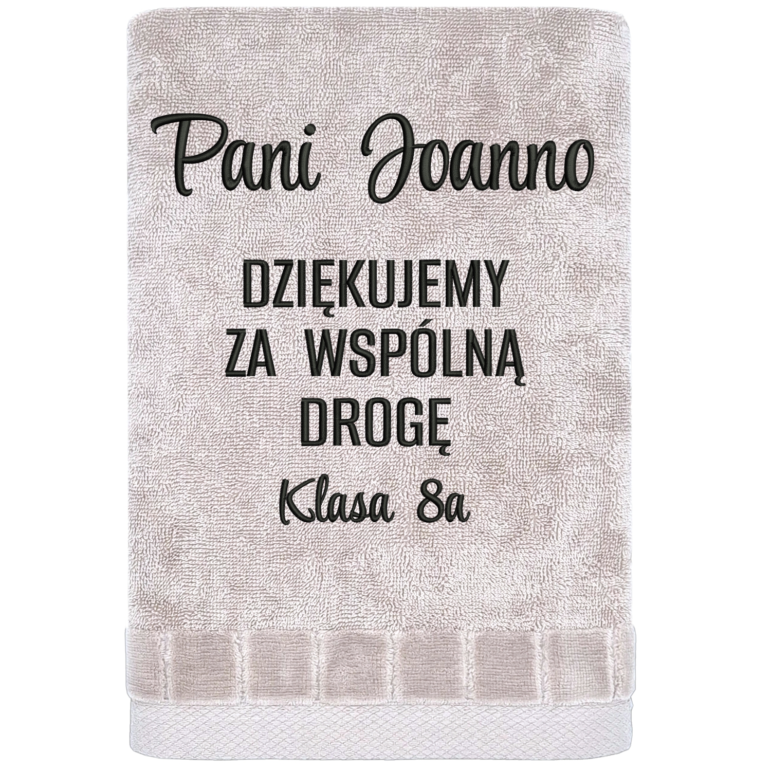 Ten ręcznik powstał po to, żeby powiedzieć coś ważnego… ale w spokojny, nienachalny sposób. Napis „Dziękujemy za wspólną drogę” nie krzyczy – on zostaje. Towarzyszy chwilom, które już były, i tym, które jeszcze długo będą wracać we wspomnieniach. To nie jest typowa pamiątka „na półkę”. To rzecz, która wchodzi w codzienność – miękka, chłonna, zawsze pod ręką. I właśnie dzięki temu działa najmocniej. Bo zamiast jednorazowego efektu, daje coś znacznie więcej: małe przypomnienie o relacji, która miała znaczenie.