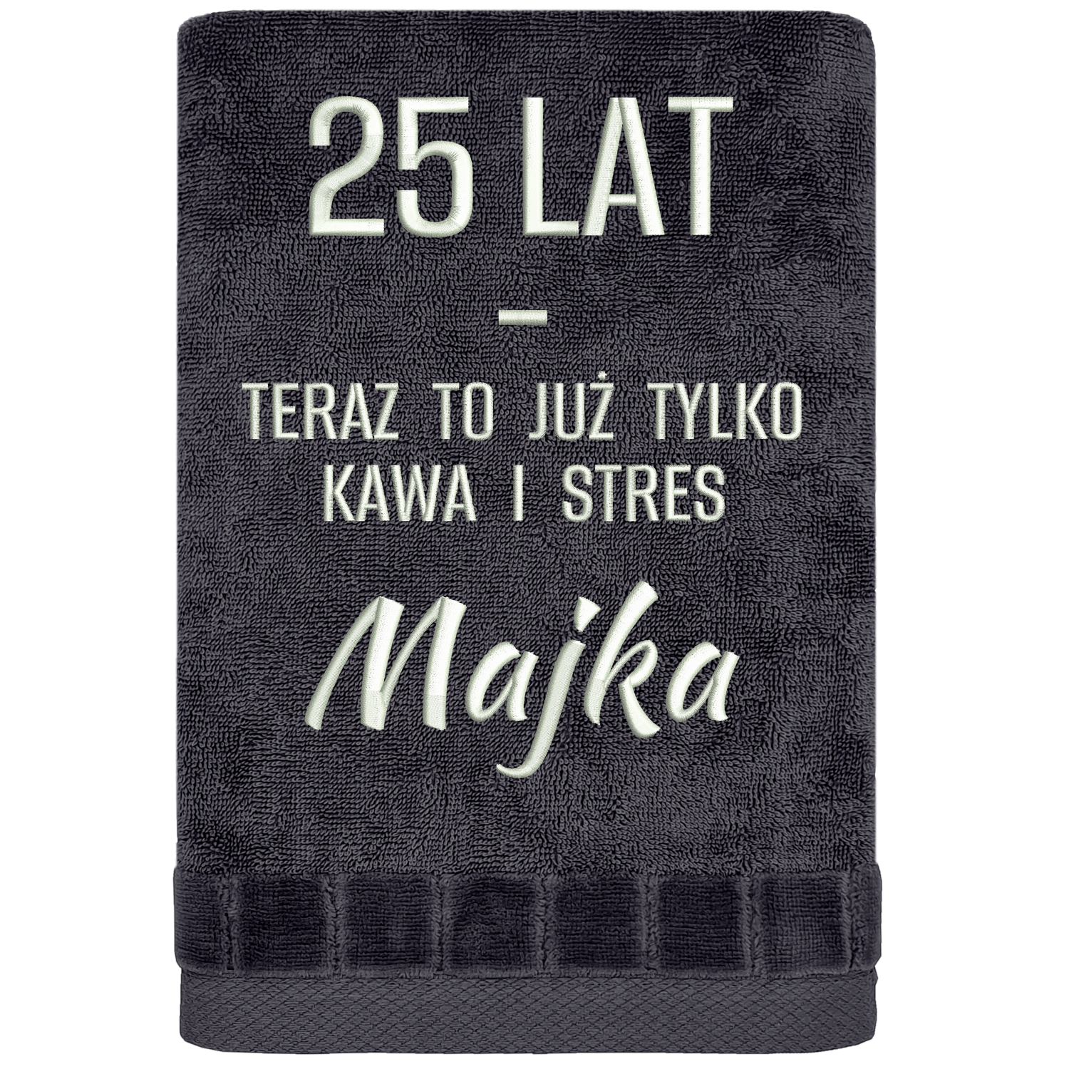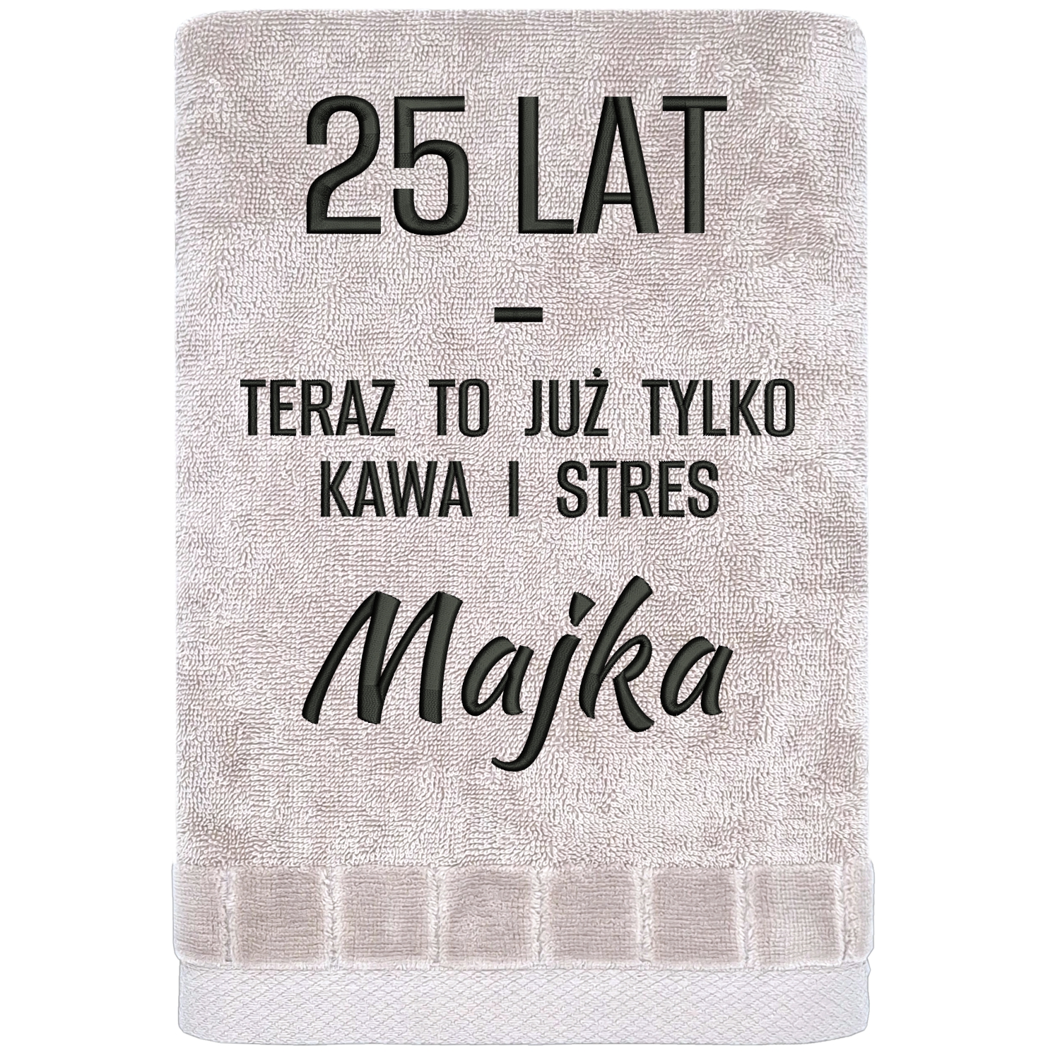 Są plany na dorosłość… i jest rzeczywistość: kawa, stres i „jakoś to będzie”. Ten ręcznik „25 lat – teraz to już tylko kawa i stres” trafia idealnie w punkt – bo to moment, kiedy zaczynasz rozumieć życie… ale ono i tak ma swoje pomysły. Najpierw widzisz napis i od razu wiesz, że ktoś tu już swoje przeszedł (albo właśnie zaczyna). Potem dochodzi personalizacja i robi się jeszcze lepiej – bo to nie jest zwykły prezent, tylko personalizowany prezent na 25 urodziny, który mówi wprost: witamy na kolejnym levelu.