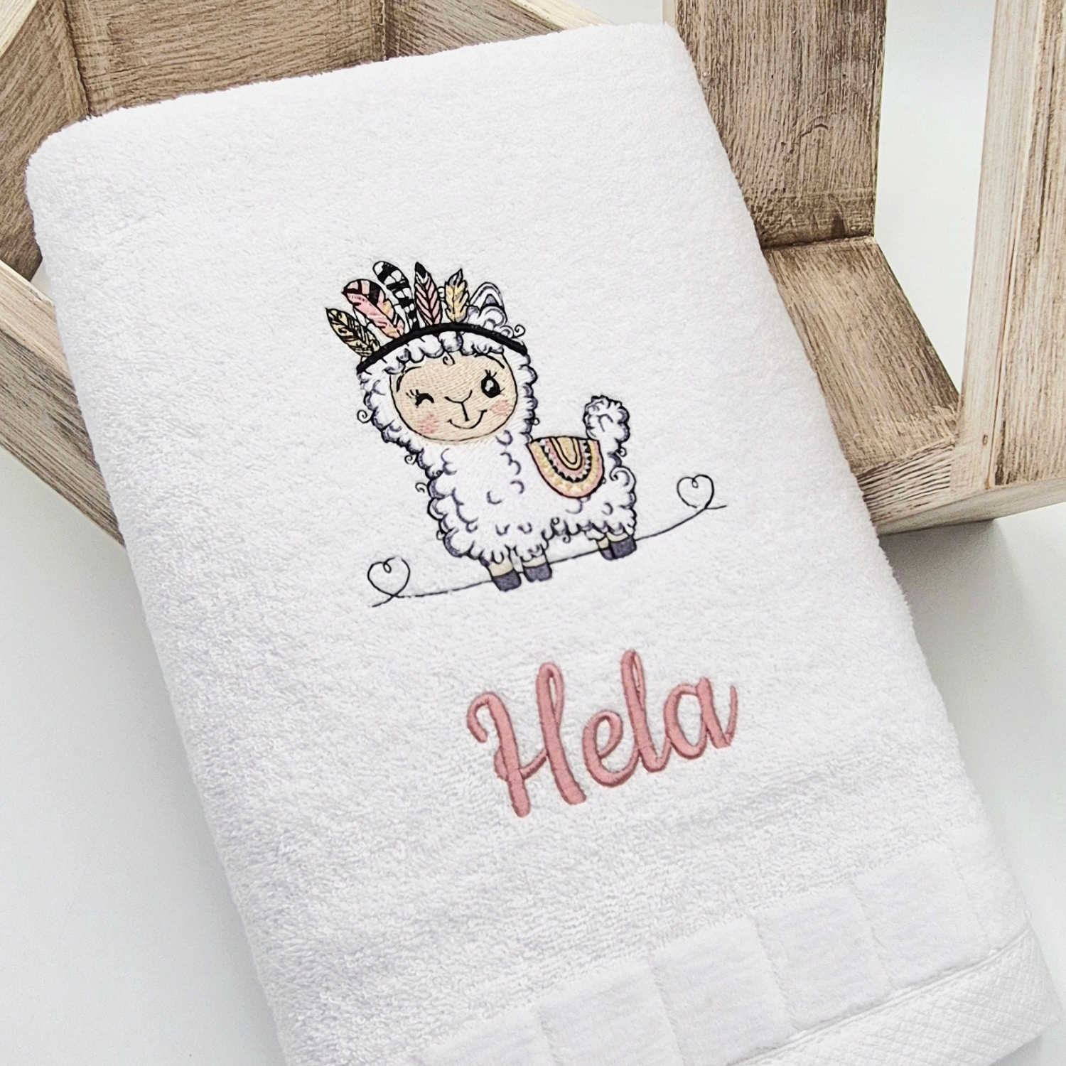 Personalizowany ręcznik z imieniem dziecka i uroczą lamą w pióropuszu, ozdobiony mięciutką bordiurą w postaci welurowej kosteczki.