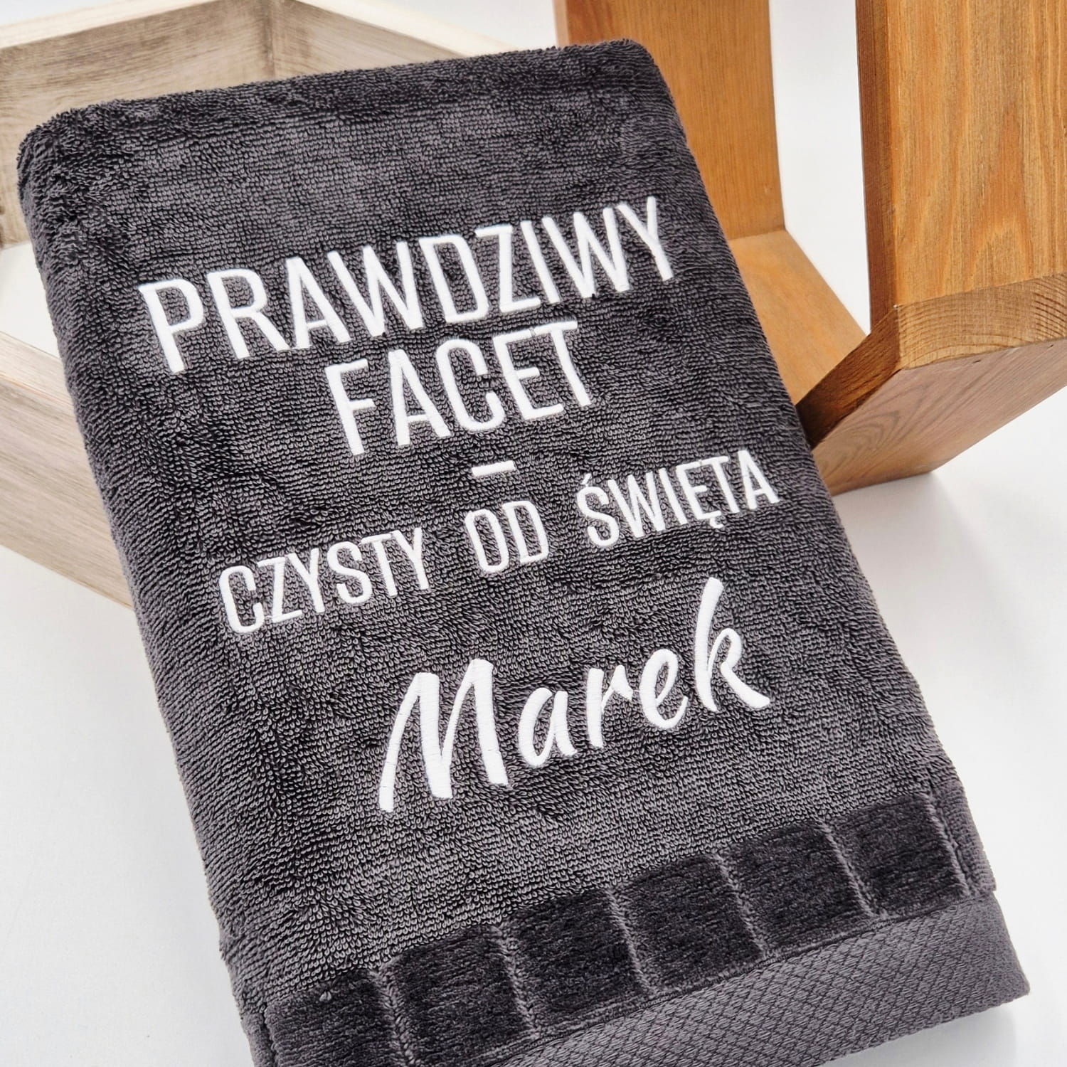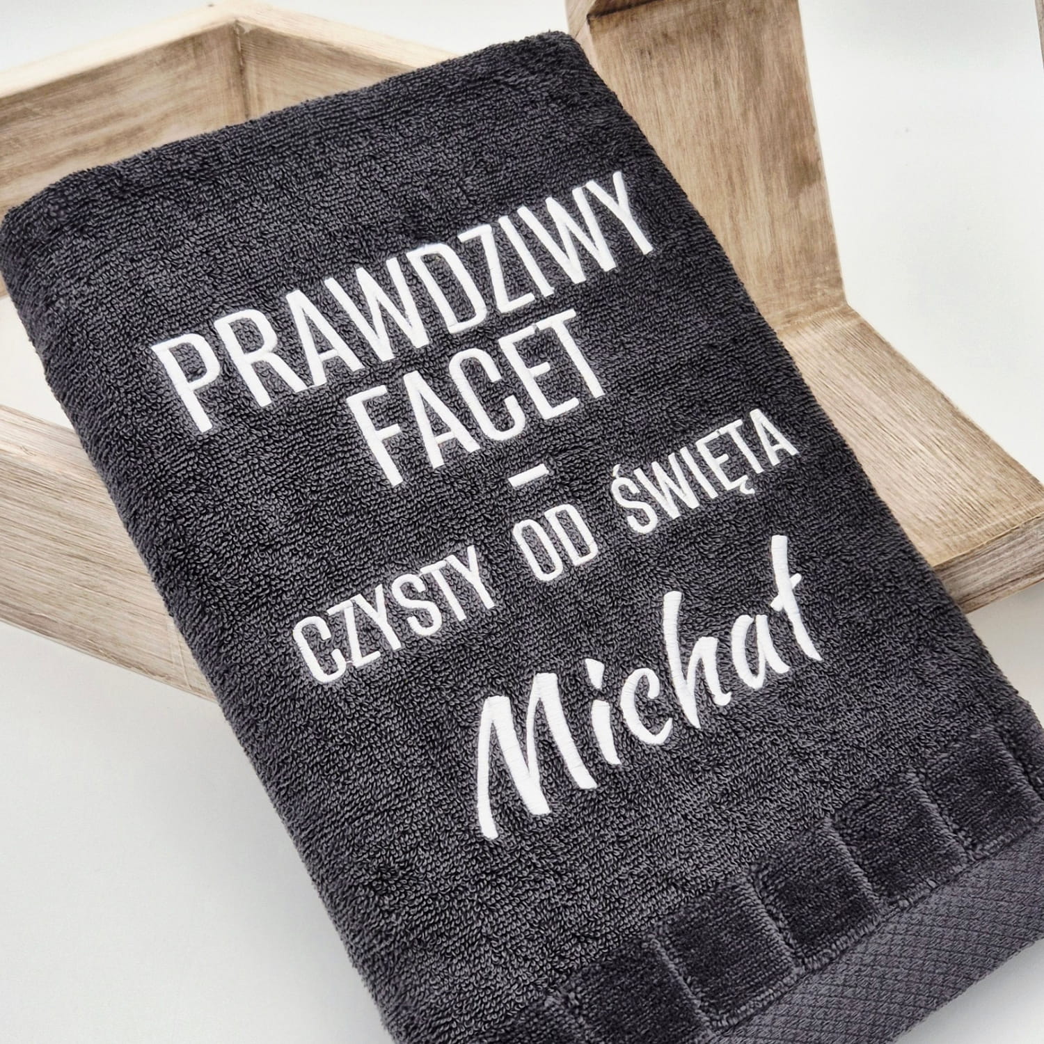 Ten ręcznik mówi wszystko – z humorem, dystansem i szczyptą autoironii. Jeśli znasz kogoś, kto do kąpieli podchodzi jak do święta narodowego – to prezent idealny. Hasło „Prawdziwy facet – czysty od święta” sprawdzi się jako zabawny dodatek do łazienki, prezent dla chłopaka, męża, taty lub kumpla, który nie boi się śmiać z siebie.