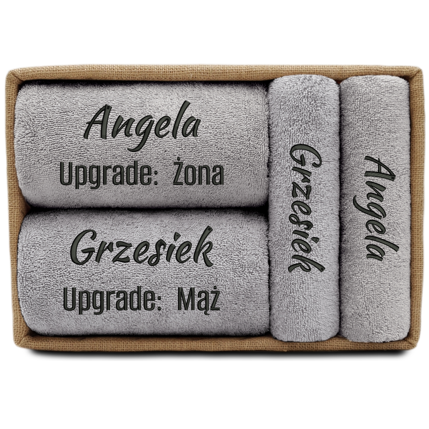 Jeśli dwa ręczniki to za mało, ten zestaw robi krok dalej. Komplet czterech personalizowanych ręczników z imionami w eleganckim koszu to bardziej rozbudowana, a przez to jeszcze bardziej efektowna wersja prezentu dla pary.